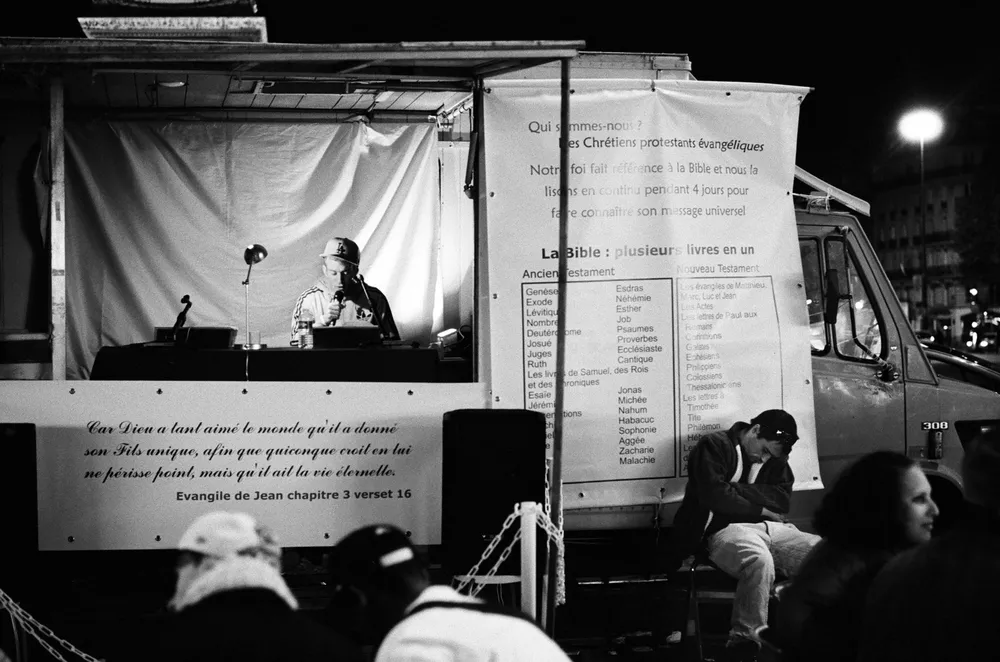 00h00 à Bastille, un groupe de gens vient lire des passages choisi de la bible : certains écoutent, d’autres dorment sur leurs chaises drôle et affligeant.