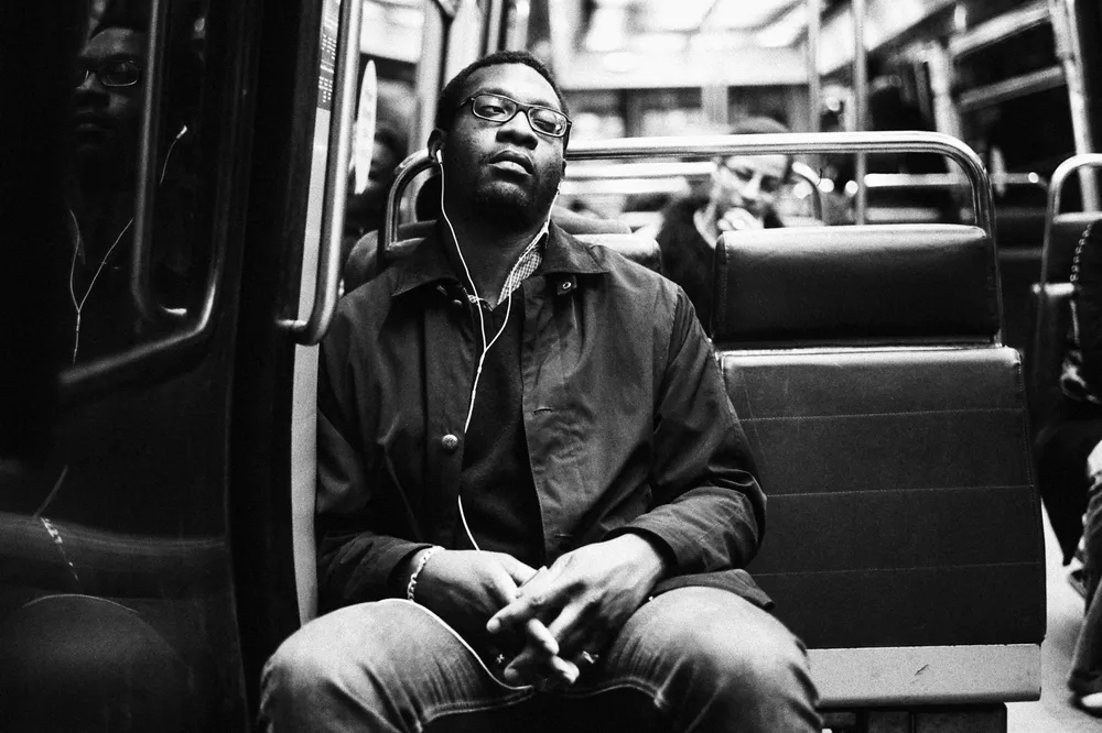 je rentre tard dans le wagon il n’y a plus de place, face à moi un homme fatigué la lumière est superbe sur sa peau noir.