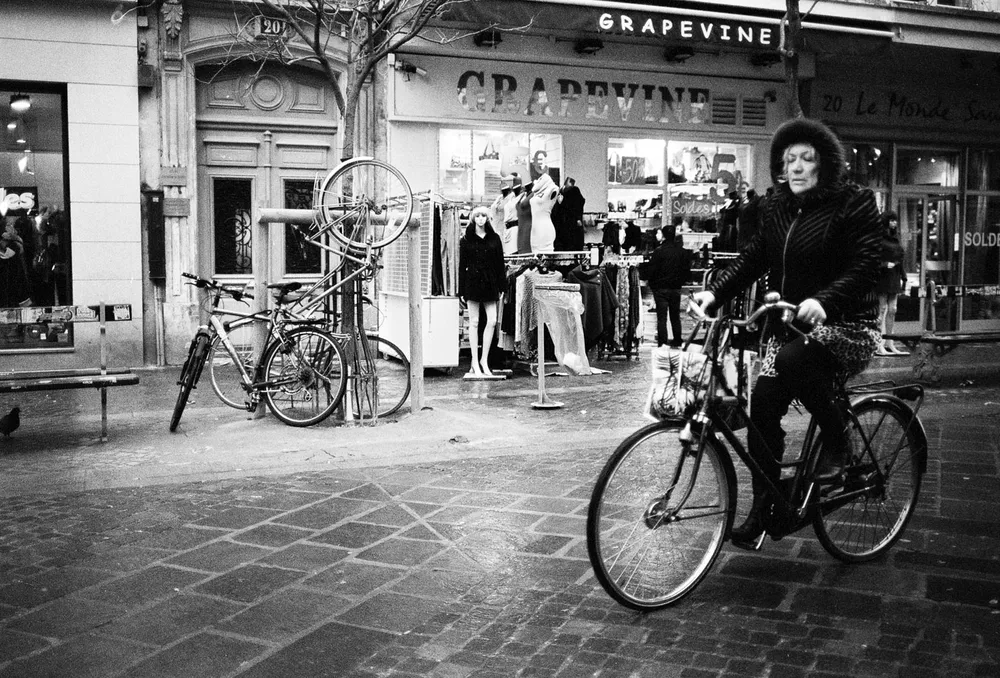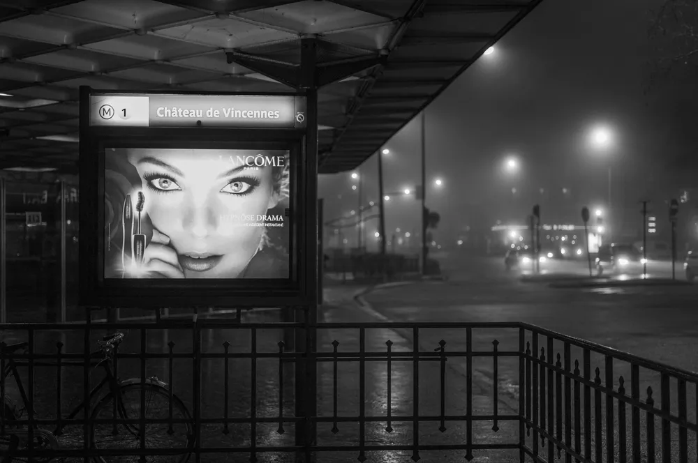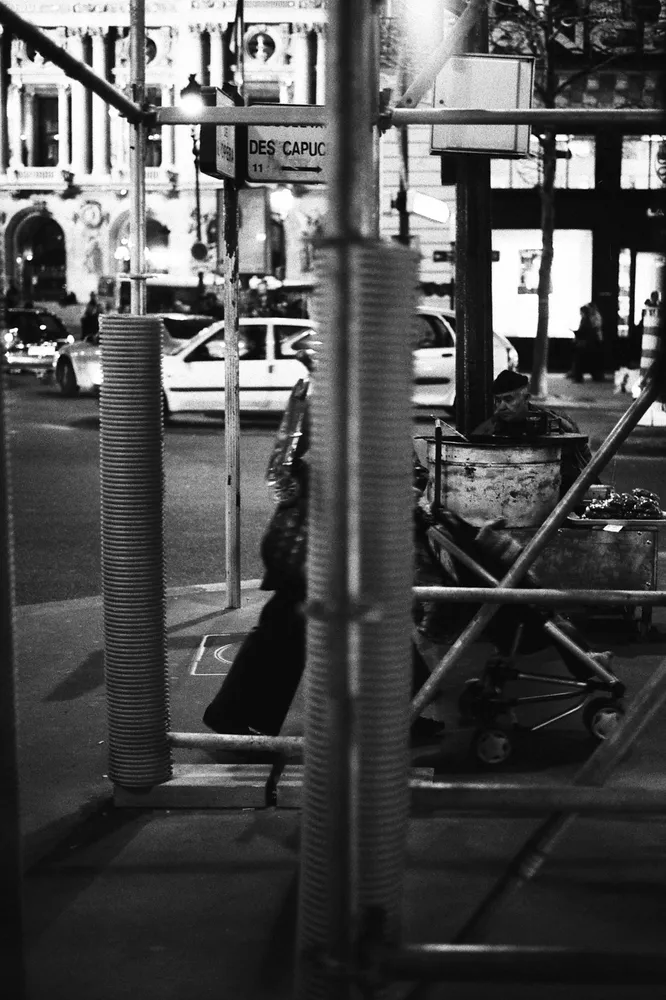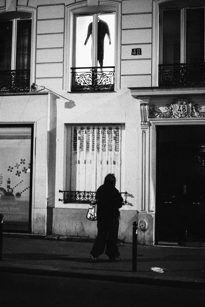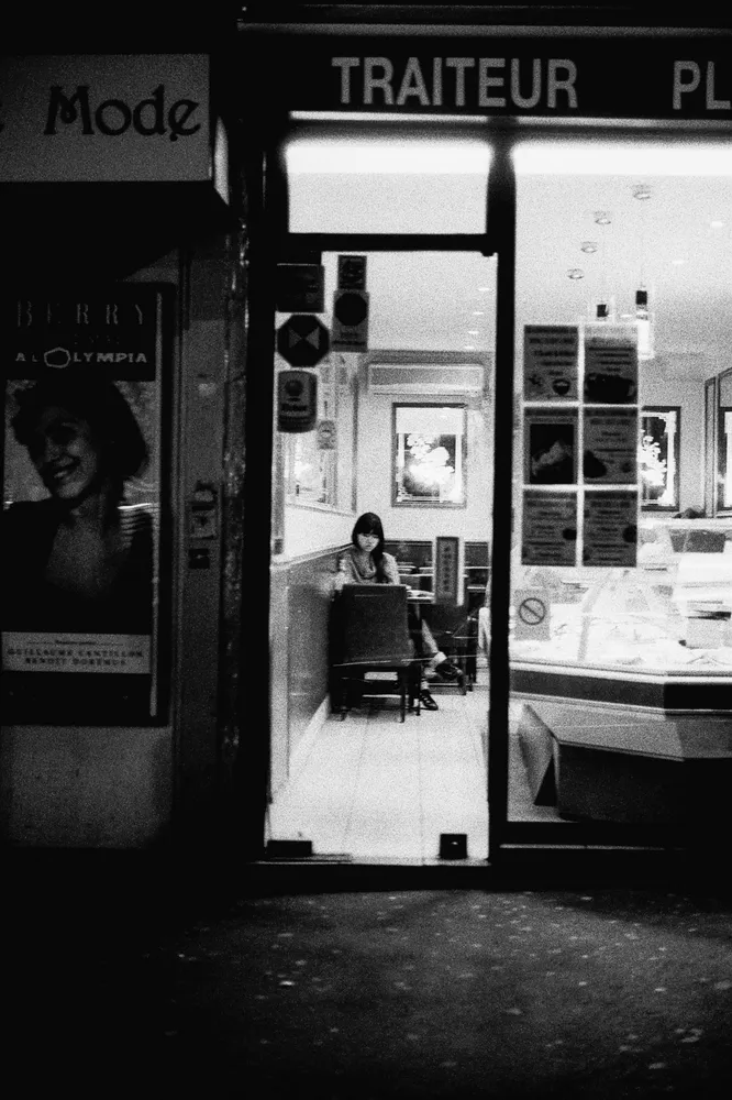 La nuit ce n’est plus les reflets de la rue que nous offrent les boutiques, mais leurs intérieurs. On trouve le sosie d’Hitchcock qui tient des registres a la sortie du moulins rouge et une pizzeria de Strasbourg Saint-Denis où est vraiment posé une Vespa sur son comptoir.