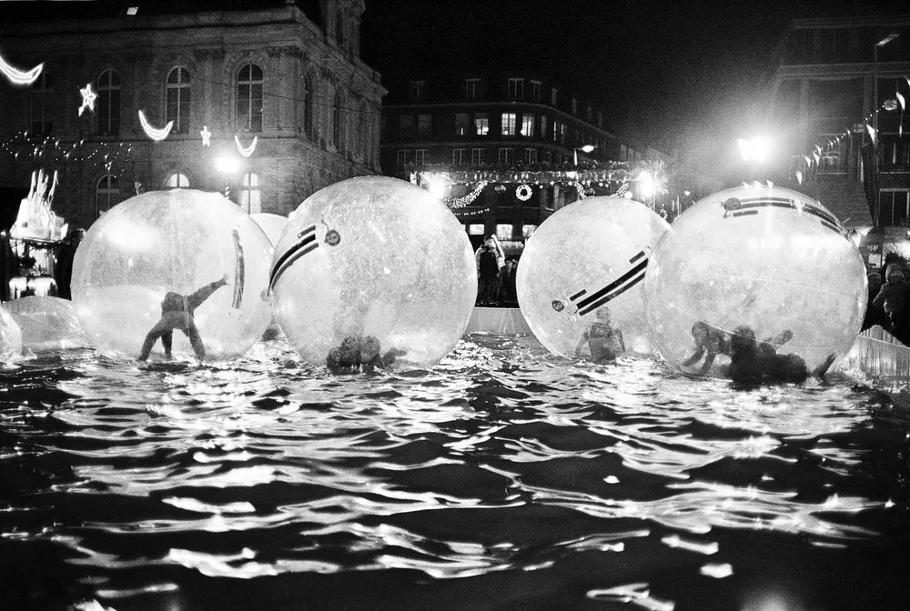 Dans une autre ville c’est Noël des enfants jouent à l’intérieur de bulles d’air géante sur l’eau