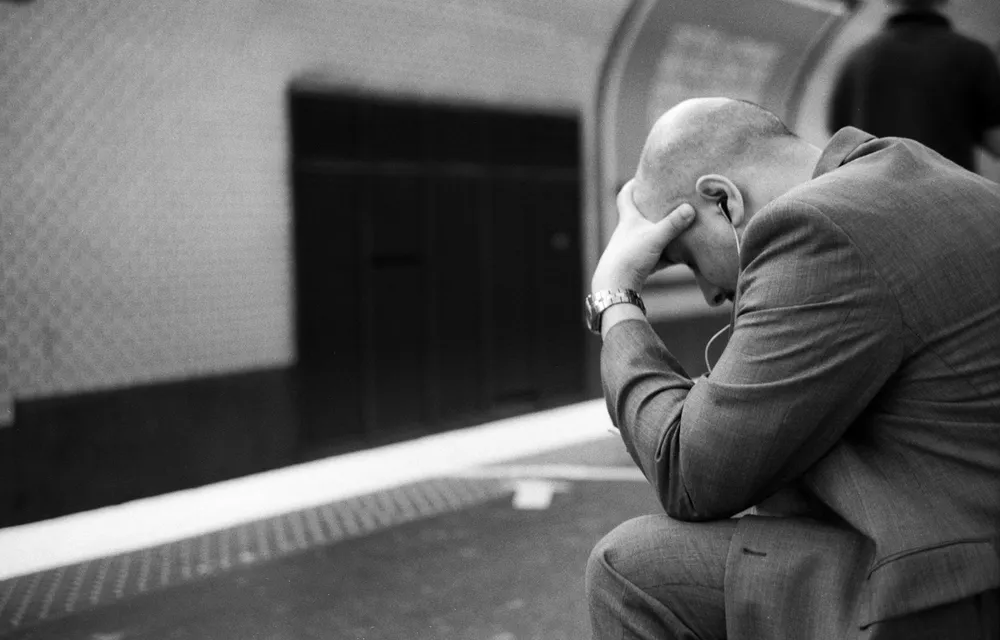 Cet homme en costume vient de jeter le journal libre service du jour, et soutient sa tête entre